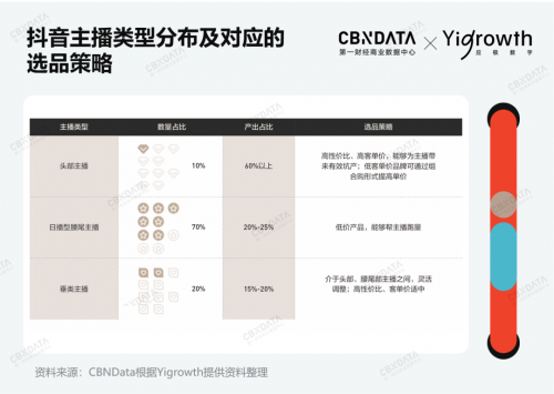 品牌投放达播的核心在于将“选人”“组货”有机结合,即划定费率标准的前提下,根据不同类型主播的数量、产出占比与选品策略,细化对应的组货机制。根据Yigrowth经验,抖音主播可被划分为三种类型:头部主播要求产品兼具高客单价、高性价比,能够带来可观的单坑产出;日播型腰尾主播主要走低价跑量模式;垂类主播的要求介于两者之间。品牌需要定向推品,提高选品通过率。
