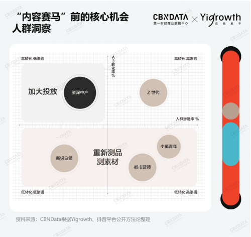 在抖音平台,品牌的种草逻辑则以“5A人群模型”为基础,将种草与购买环节强绑定,完成“心智种草-人群资产-店铺下单”的闭环。为提高转化效率,品牌多利用“内容赛马”筛选出用户感兴趣且效果好的内容。“内容赛马”即品牌运用内容素材进行大量实验多方测试,最终在其中选择出爆款、优质的内容,形成一定可复制的投放策略。在此过程中,关键点在于找准行业趋势、核心人群及用户需求。品牌可以将A3(种草)人群转化率、投放内容的整体人群渗透率作为参考维度,把用户划分为四类,锚定高转化、低渗透人群加大投放。对于低转化、低渗透及低转化、高渗透人群,品牌需重新测品测素材。
