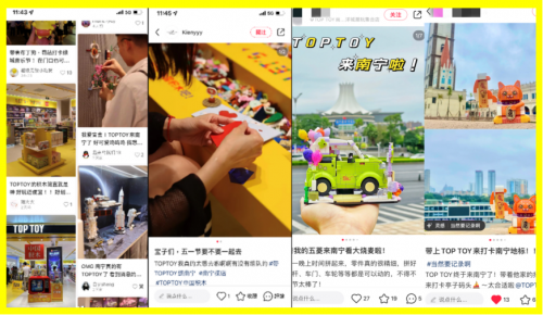 在线上,TOP TOY在小红书平台发起的#带TOP TOY游南宁活动,吸引百位潮人带着TOP TOY的产品来到南宁地标拍照打卡,成功激起用户兴趣。随后又依托抖音、小红书等社交平台的200+本地达人与品牌官方矩阵宣导进一步预热,将目标消费者和潜在消费者吸引到门店社群中。