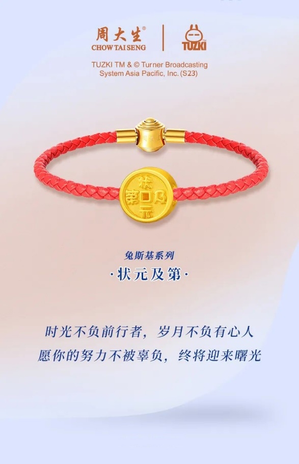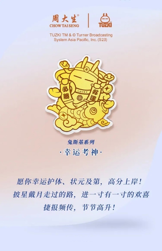 每个学子都期盼幸运考神眷顾自己,能够稳定发挥,考试顺利。与深受学子喜爱的二次元IP形象兔斯基联名的周大生珠宝“幸运考神”精致小巧黄金贴,每一个细节都是精心设计的幸运元素。颇为精巧的是一眼入目的兔斯基手持对联,上联“必胜”、下联“好运”,承载着对考生的满满祝福。其次是独出心裁兔斯基头顶的“吉星”、帽檐上的“如意”、胸前佩戴的“禄星”、周围环绕的“祥云”以及底部吐着元宝的“小锦鲤“,寓意吉星高照、顺心如意、好运连连以及如鱼得水、鱼跃龙门等。可以说,对学子的所有美好祝福都藏在这块小巧的金贴里头。