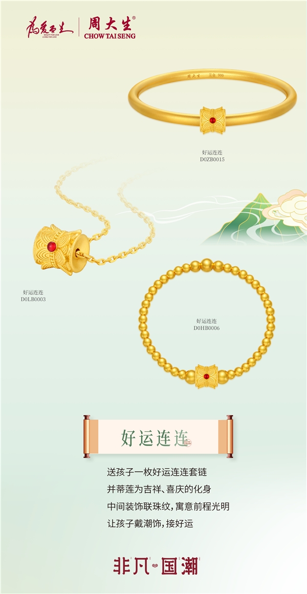 好运降临,气场全开。周大生珠宝“好运连连”套系,采用民间视作吉祥、喜庆征兆的并蒂莲为设计元素,寓意好运连连。并蒂莲中间装饰联珠纹,寓意前程光明,红色珐琅居中,提升喜庆的国潮氛围感,戴潮饰,接好运!