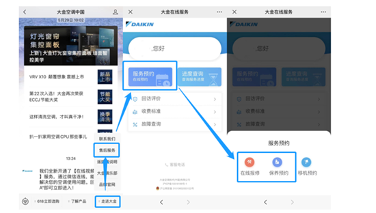 在“大金空调中国”官方微信公众号,点击下方菜单栏“走进大金——售后服务”,选择“服务预约”,点击“在线报修保养预约即可。