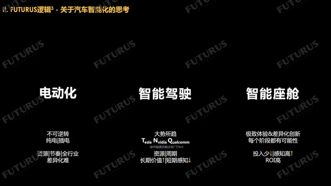 智能座舱,是目前用户感知程度最高的差异化切入,如果押注的方向正确,以很小的开发投入,就能实现极致的用户体验和差异化创新,用户体验差异化感知非常明显,且伴随电动化和智能驾驶的阶段跃升都有比较清晰的切入,想象空间比较大。这也正是FUTURUS深耕智能座舱的原因。