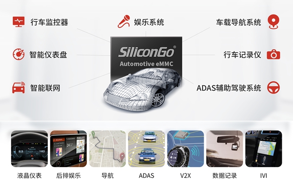 得一微车规级eMMC具有封装尺寸小,可靠性高,一致性好,磨损次数超长等特点,使其成为前装汽车应用的理想选择。同时,异常掉电后的数据保护、强大的热管理机制,严格的鉴定、生产测试环节保证产品在严苛的环境中能完美展现自身的强大性能。非常适用于汽车的液晶仪表、T-box、 ADAS、智能座舱、车载信息娱乐系统、事件记录仪等系统中,在工业领域亦可用于电力系统、轨道交通、安防监控、无人机图像采集、工业自动控制等设备。