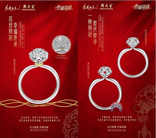 周大生珠宝在中秋国庆婚嫁季送出的多重好礼不仅彰显满满诚意,其主推的产品也十分应景。“花丝凤冠”作为幸福花嫁系列的最新设计,以凤冠为设计灵感,将古代象征着尊贵奢华的一方风情融入“花丝凤冠”中,彰显雍容华贵之美。花头下方与精美花丝交织缠绵,花丝虽小,却蕴含无穷巧思。周大生以花丝工艺为设计灵感,用现代珠宝工艺再现绵延千年的花丝形态,古今联结传承匠心独运。“幸福花冠”作为幸福花嫁系列的经典标志款,以婚嫁美好象征的凤冠造型为戒托,如中国新娘红妆大嫁的奢华凤冠,象征为爱加冕,荣宠一生的幸福。“蝶恋花”采用精品拉丝工艺再现群舞的蝴蝶,金光莹莹,蝶影翩翩,伴于爱人身侧,诠释两情相悦。“初心永固”以金瓯永固杯为设计灵感,男款取“永固”与回纹元素,寓意爱意不绝;女款取宝相花、缠枝纹和“永固”纹样,寓意幸福绵延。男女款可拼合的巧妙结构,传递“夫妻和合,长情永固”的最美祝福。