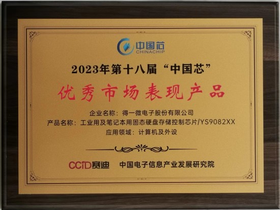 9月20日,第十八届“中国芯”优秀产品征集结果在2023(第十八届)“中国芯”琴珠澳集成电路产业促进大会上公布。凭借过硬的产品实力和亮眼的市场表现,得一微电子(YEESTOR)的“YS9082XX系列工业用及笔记本用固态硬盘存储控制芯片“从众多参评产品中脱颖而出,荣获2023 “中国芯”优秀市场表现产品奖。