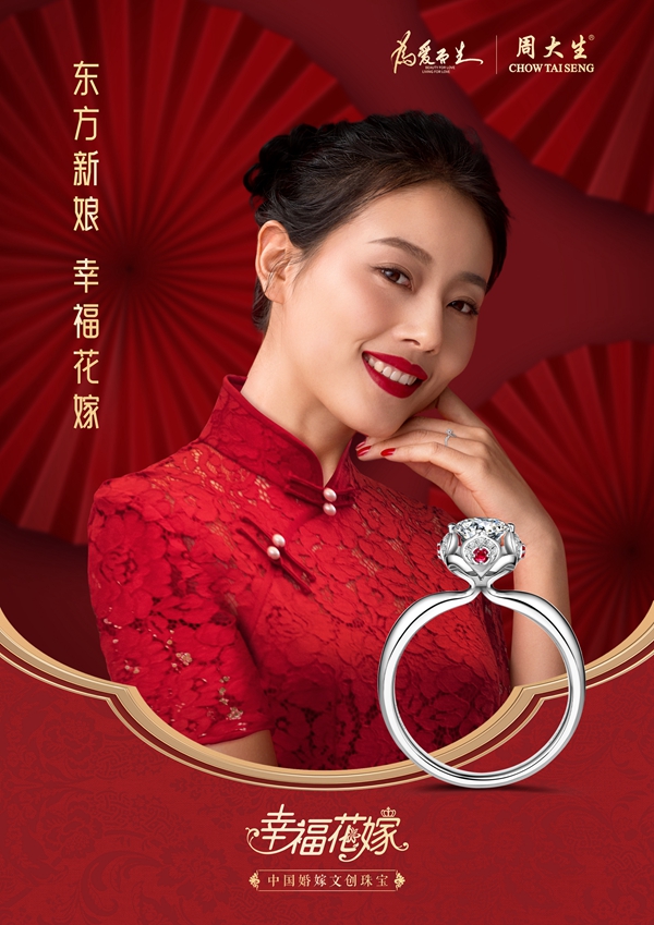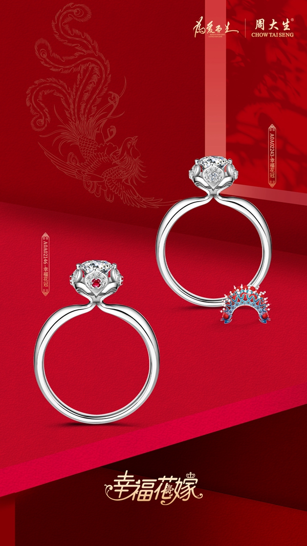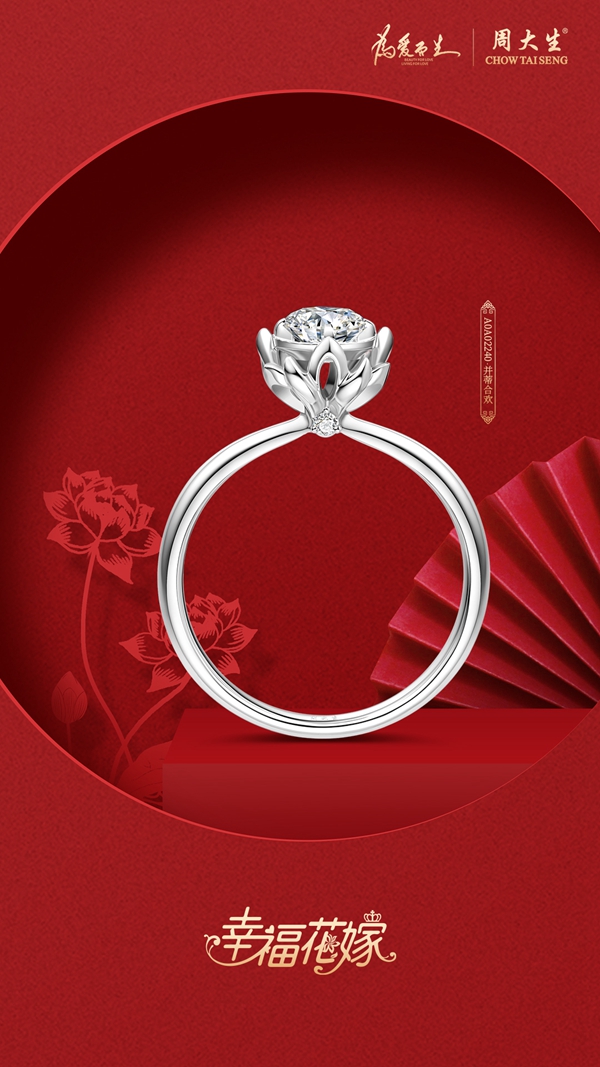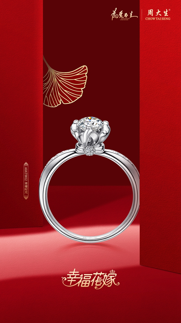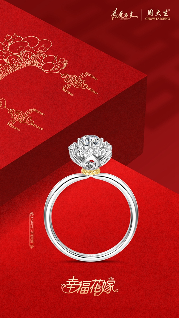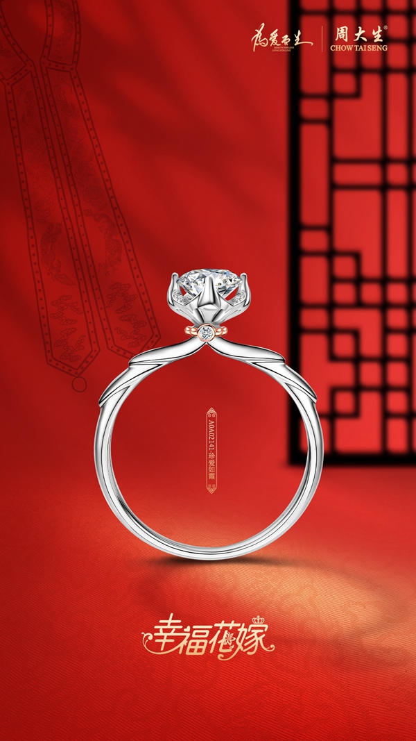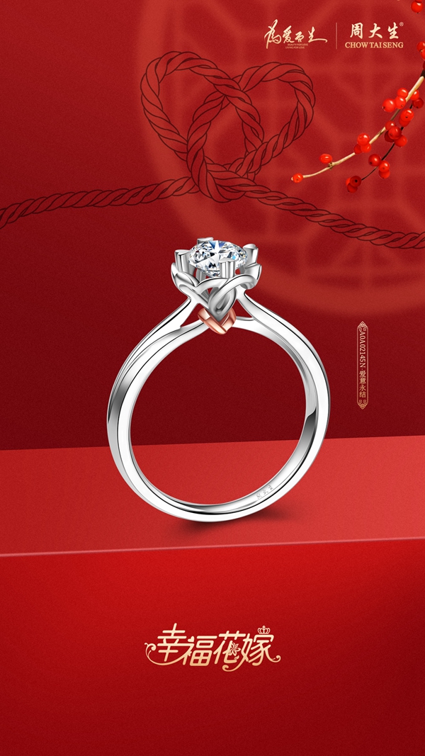 周大生秉承“为爱而生”的品牌理念,深度挖掘中国传统婚恋文化故事,以中国传统文化元素为源,融入祥瑞富贵、爱情寓意的图案,打造中国婚嫁文创珠宝——“幸福花嫁”系列,每一枚融入中式元素的钻戒,都承载着一个个源远流长的传统故事,让“幸福花嫁”带您回到古代,体验东方恋人的浪漫点滴。