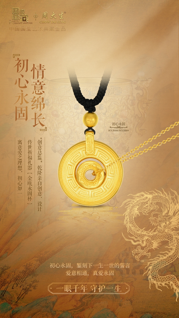 现藏于故宫博物馆的珍贵国宝——金瓯永固杯,在《国家宝藏》节目中一经亮相便受到广泛关注。金瓯永固杯是乾隆亲自订制的金杯,因中部錾篆书“金瓯永固”而得名。周大生从金瓯永固杯中汲取设计灵感,古法金的典雅精妙赋予其赏心悦目的视觉效果,男款取“永固”与回纹元素,寓意爱意不绝;女款取宝相花、缠枝纹和“永固”纹样,寓意幸福绵延。男女款可拼合成巧妙结构,一对壁人,一对配饰,双生双伴,相融相合。周大生镌刻东方印记,传承百年风华,传递“夫妻和合,长情永固”的最美祝福。