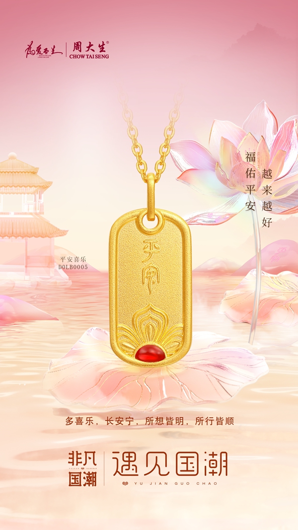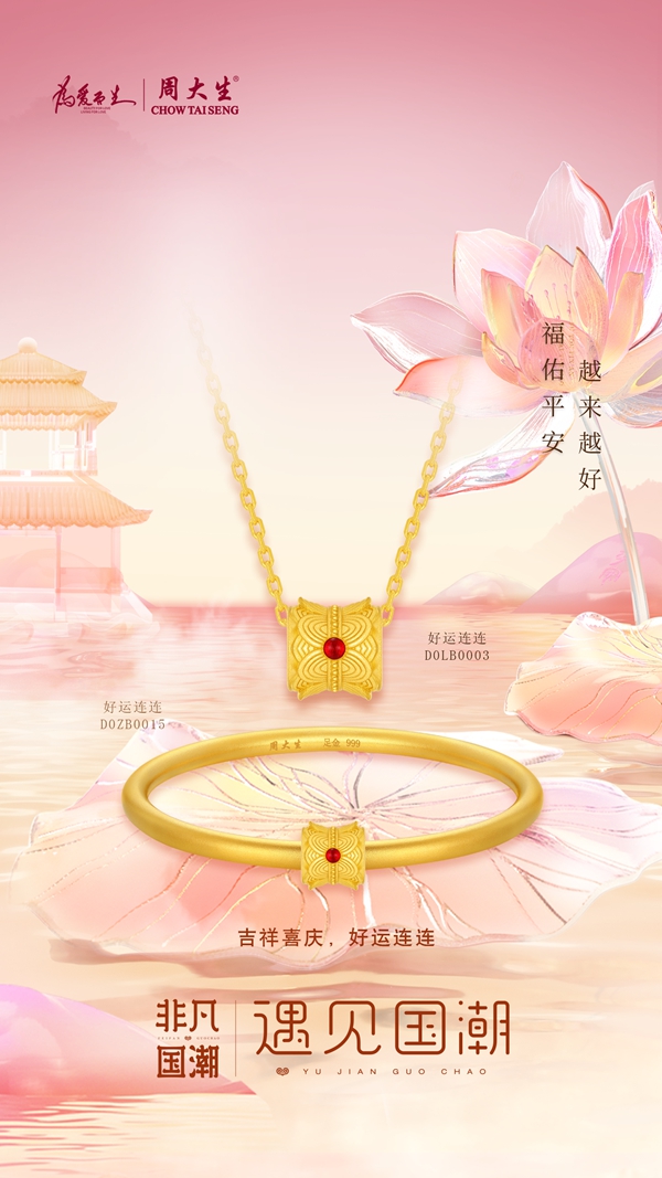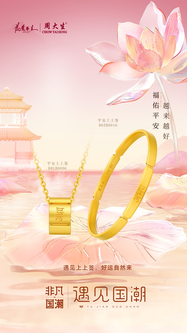 当五千年文明遇上时尚弄潮,当经典和现代对撞,该如何平衡两者之间的关系?周大生用“非凡国潮”系列之一的“遇见国潮”给出一份优秀答卷。“遇见国潮”汲取经典馆藏国宝及文物中的福佑文化,将并蒂莲、“签文化”、宝相花等寓意着吉祥、喜庆、平安等元素融入产品设计中,将传统文化的历史厚重感与现代潮流黄金饰品融会贯通,形神兼备,气韵生动,为消费者献上别具一格的国潮黄金饰品的同时,更向消费者传递“福佑平安,越来越好”的美好祝愿。