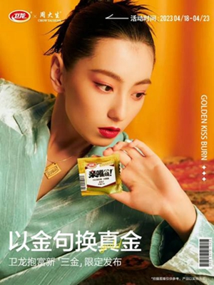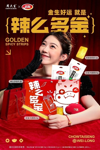 其实这不是周大生与卫龙品牌第一次合作,早在2023年4月份,周大生就携手卫龙带来限定版只送不卖的“卫龙抱富新三金”礼包,“用金句换真金”的主题和玩法让消费者直呼“上头”。作为陪伴每一代消费者成长的国民品牌,周大生在年轻化趣味营销上向来走在珠宝业界前沿。