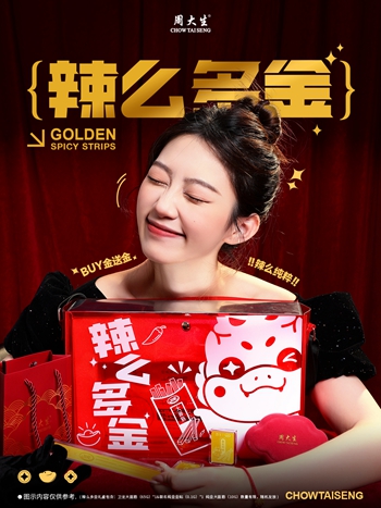 手腕上的生肖龙转运珠让卫龙辣条成“金”啦?!周大生火龙果产品化身转运使者,为消费者带来财运与好运!一支创意趣味短片官宣周大生与卫龙联名,引出联名幸运金贴、金辣条、辣么多金礼盒等产品周边。巧妙将周大生生肖龙产品从功能价值上升到情感价值,将产品从功能上的高颜值配饰进阶成给人们带来生肖祈福寓意的精神慰藉。从年轻化角度,打造#金生好运就是辣么多金#趣味话题,寓意周大生给消费者传递好运祝福,让消费者拥有点“食”成金的超能力。