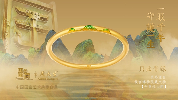 周大生x国家宝藏系列中,以《千里江山图》设计灵感和元素的千里江山系列黄金和钻镶产品尤为火爆,深受大家喜爱。系列产品提取画中起伏峰峦与青绿国色,融入现代审美设计与工艺,在珠宝上再现北宋锦绣山河,承载绿水青山的吉祥美好寓意。