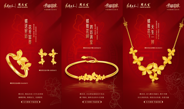 幸福花嫁系列新品“蝶恋花”套系以象征爱情、自由与美丽的蝴蝶为主要设计元素,将永恒不变的黄金作为媒介,精品拉丝工艺呈现出蝴蝶栩栩如生的群舞姿态,寓意爱情忠贞不移,永恒不变。
