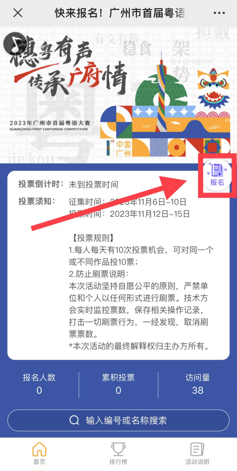 即日起,大赛在广州市内已启动线上招募及投票,喜爱粤语和广府文化的非专业粤语表演人员均可报名,鼓励“非粤语人群”“新广府人”参与,在赛事中学习、关注并爱上广府话。市民可通过关注“广州市文化广电旅游局”微信公众号,在菜单栏的“左下角”点击进入“e键通”,首页找到大赛主画面点击进入即可报名和投稿。