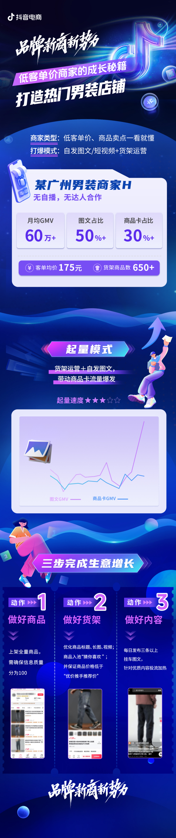 然而,也不乏很多商家虽然想依托抖音电商实现生意新突破,但出于对平台政策、运营方法等不熟悉而望而却步。对此,抖音电商面向“新商”,打造4步走方法论和7种典型起量模式,为新商降低入驻门槛和成本,令其入驻后能快速起量,并且掌握成长的方式方法,获得快速、确定性生意增长,在抖音电商释放更大生意潜能。