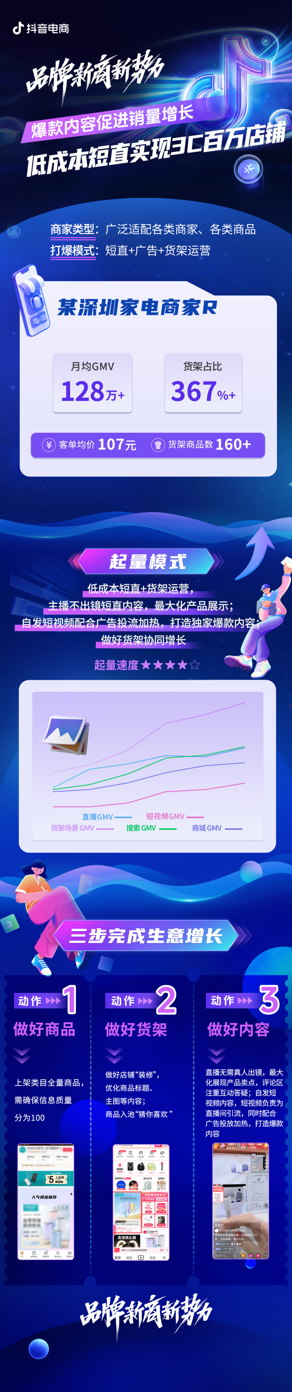 为了广泛适配各种类型商家,抖音电商还组合“达人直播+货架运营”、“短直+广告+货架运营”两种模式。“短直+广告+货架运营”主要方式是启动自播,每天发布多于1条短视频及投放千川,某深圳家电通过自播,月均GMV达到128万,为这一模式打造了成功的示范。