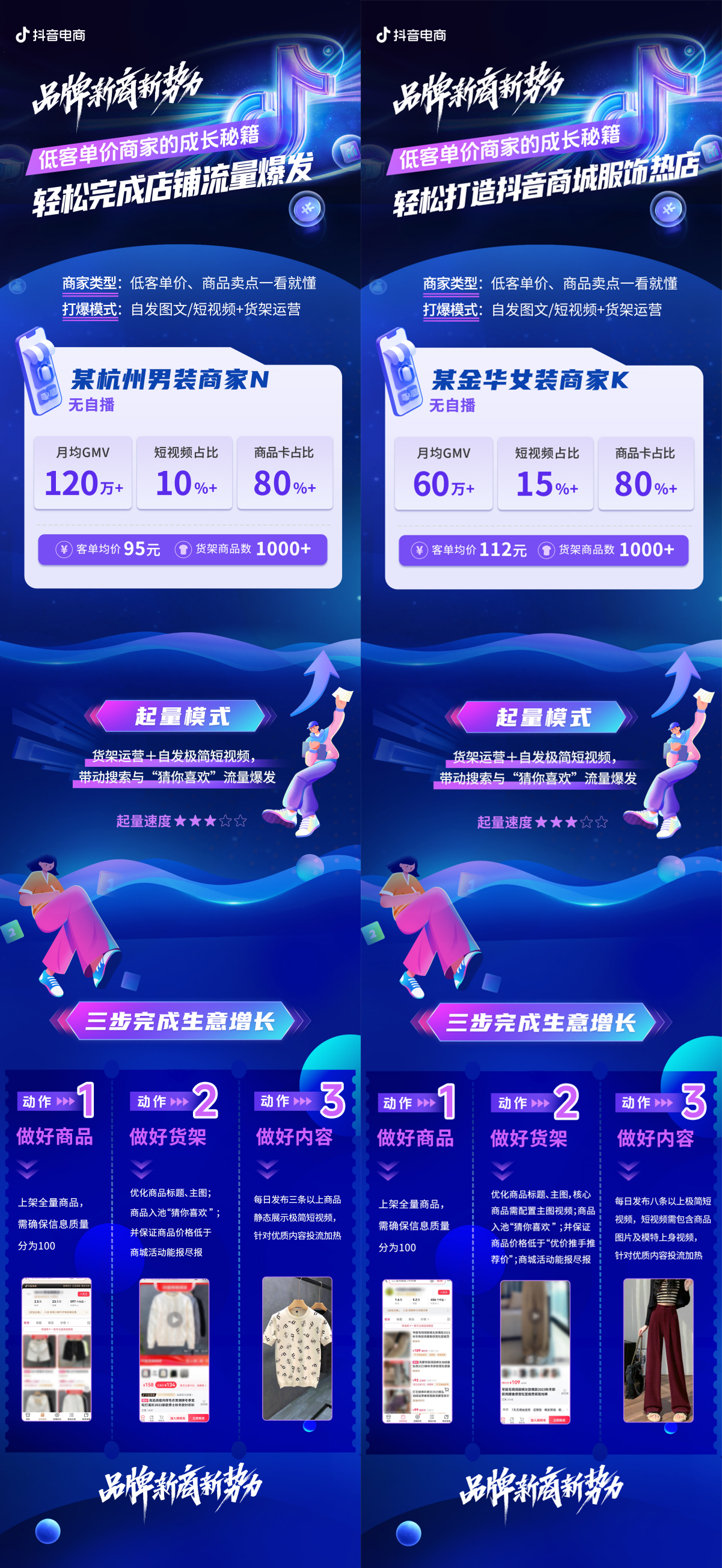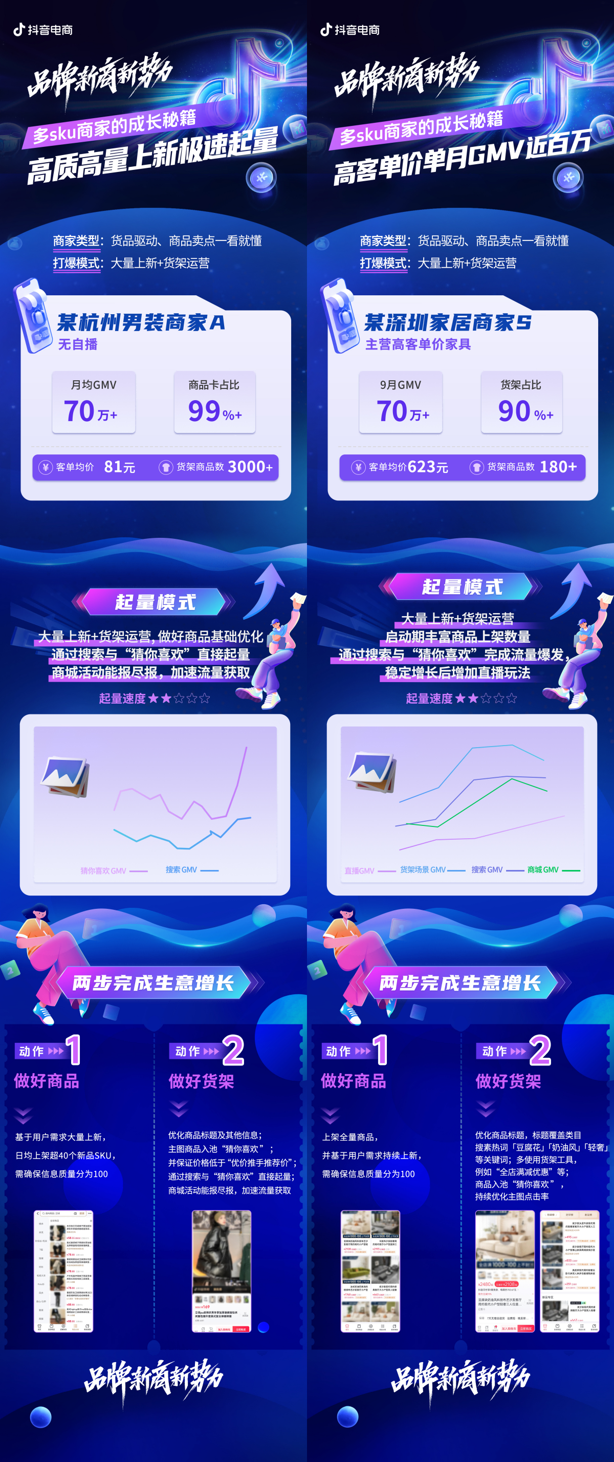 针对单爆款驱动型商家和多sku商家,抖音电商组合出“商城活动+广告加速”、“大量上新+货架运营”两种模式,帮助其快速完成货架场搭建,提升货架运营能力。从实践来看,某家具日用商家入驻抖音电商仅仅1个月时间,即快速完成超40款商品上架、Top商品的价格及标题等优化,以及报名商品卡广告和商城秒杀活动等,当月累销订单即超过1.5万;某家具品牌无直播、自播,用冷启动的方式入驻后迅速完成1.5万+累销订单,其中货架占比93%。