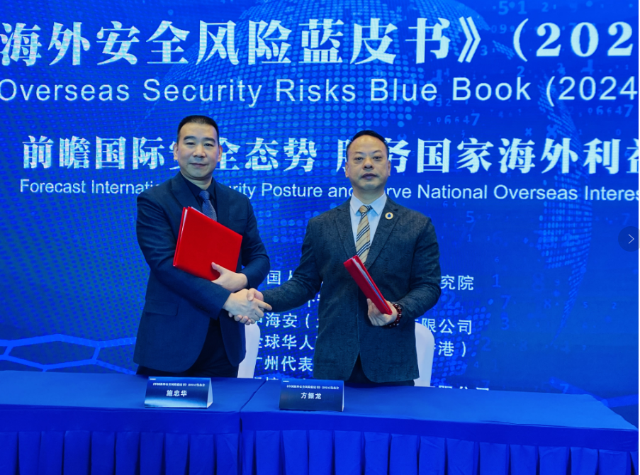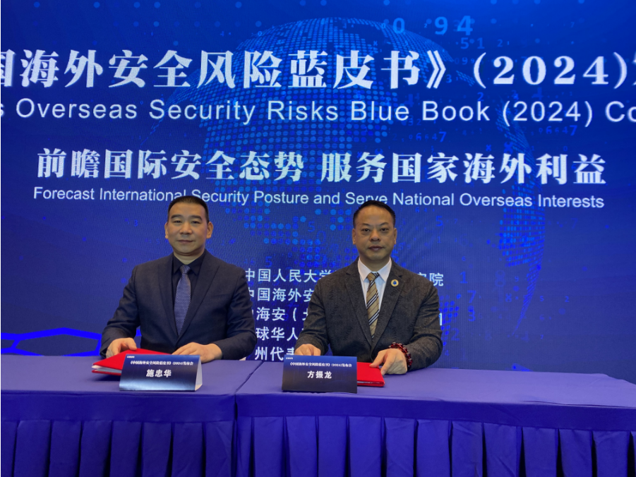 2024年1月24日下午,《中国海外安全风险蓝皮书》(2024)发布会暨中国海外安全高端论坛在中国人民大学文化大厦成功举办。此次会议由中国人民大学国家安全研究院与中国海外安全研究所主办,全球华人联合总商会(香港)广州代表处协办,中海安(北京)咨询有限公司承办。