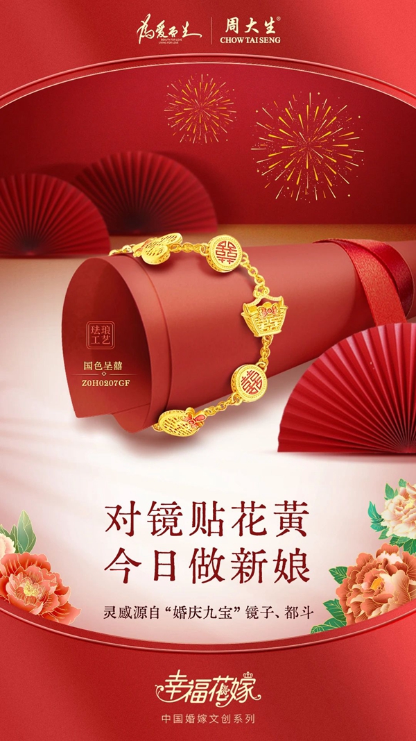 随着中国传统文化的复兴,越来越年轻人喜欢上传统与现代相融合的新中式婚礼,新中式是在保留传统元素的基础上,增加潮流时尚元素,这一点在婚礼服饰上显得尤为明显,因此,人们对于结婚五金首饰的选择,也更加注重其“中式”审美与文化价值。周大生珠宝基于对Z世代适婚一族婚嫁观念的理解,结合“为爱而生”的品牌理念,提取中国文化元素,推出全新的幸福花嫁系列【国色呈囍】套系,以国色牡丹和婚庆九宝为设计灵感元素,采用黄金珐琅、倒模等工艺,汇聚多重喜庆祝福,满足消费者多场景应用的需求。