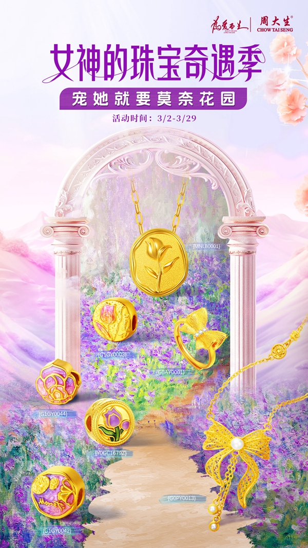 她自由浪漫,她淡若清风;她刚柔并济,她坚如磐石。当代女性画像千差万别,但汇聚起来便是无与伦比的“她力量”。她们用身体力行传递爱与希望,也值得拥有最好的宠爱。周大生珠宝在女神节之际推出“女神的珠宝奇遇季,宠她就要莫奈花园”主题活动,以爱为名为女神们送上独家浪漫钜献。抽奖活动限定回归,郁金香钻石套链、钻石口红挂坠、莫奈花园金箔画等好礼抢先送;更有周大生特别定制的9.9元女神奇遇礼包超值抢购,莫奈花园主题 AI 拍照活动体验一键穿越到浪漫奇境。这个女神节,周大生有惊喜、有浪漫、有新意,将独一无二的宠爱送给每位女神,感受被爱的温暖与感动。