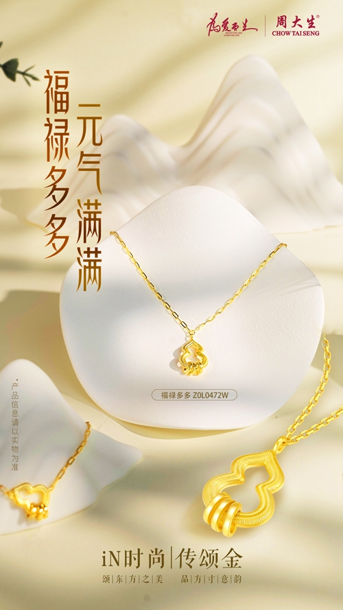 品方寸意蕴,传国潮匠艺,颂东方之美。周大生iN时尚-传颂金系列,将东方文化经典符号与时尚设计融合,打造蕴含中华数千年文化积淀与诗意传承的中式珠宝,解锁中式之美,传递新中式黄金美学。通过珐琅点翠、宝石肌、云锦等独特工艺,打造极简现代中式珠宝,衬托女性的优雅气质。“福禄多多”套系造型为多个葫芦搭配组合而成,层次丰富,立体有质感,CNC科技精工邂逅东方织造云锦工艺,将美感与细腻贯彻到底,寓意多重福禄,在特殊时刻佩戴,多重好运降临。