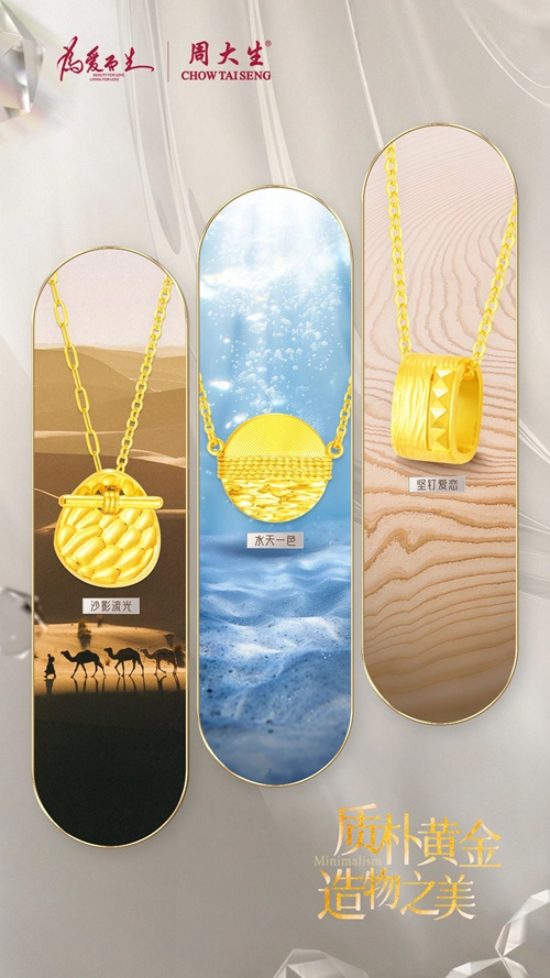 化繁为简,探索极简主义的美学源头,享受经典极简的包容性。周大生iN时尚-高亮金系列,以几何学中基础的线、面等元素,进行延展、堆叠,变换构筑不同形态,结合起脊、线条分割等设计手法,塑造简约复古的iN时尚造型,引领潮流前沿,搭配无限可能。“爱·心动”套系以极简爱心几何呈现至纯至简的爱,无惧时光流转,致美永存,通过CNC与倒模,车出亮丽炫纹,利用激光刻字,刻出专属英文印记,借助高精密镭射焊接,使整体更加精细、独特和个性化。