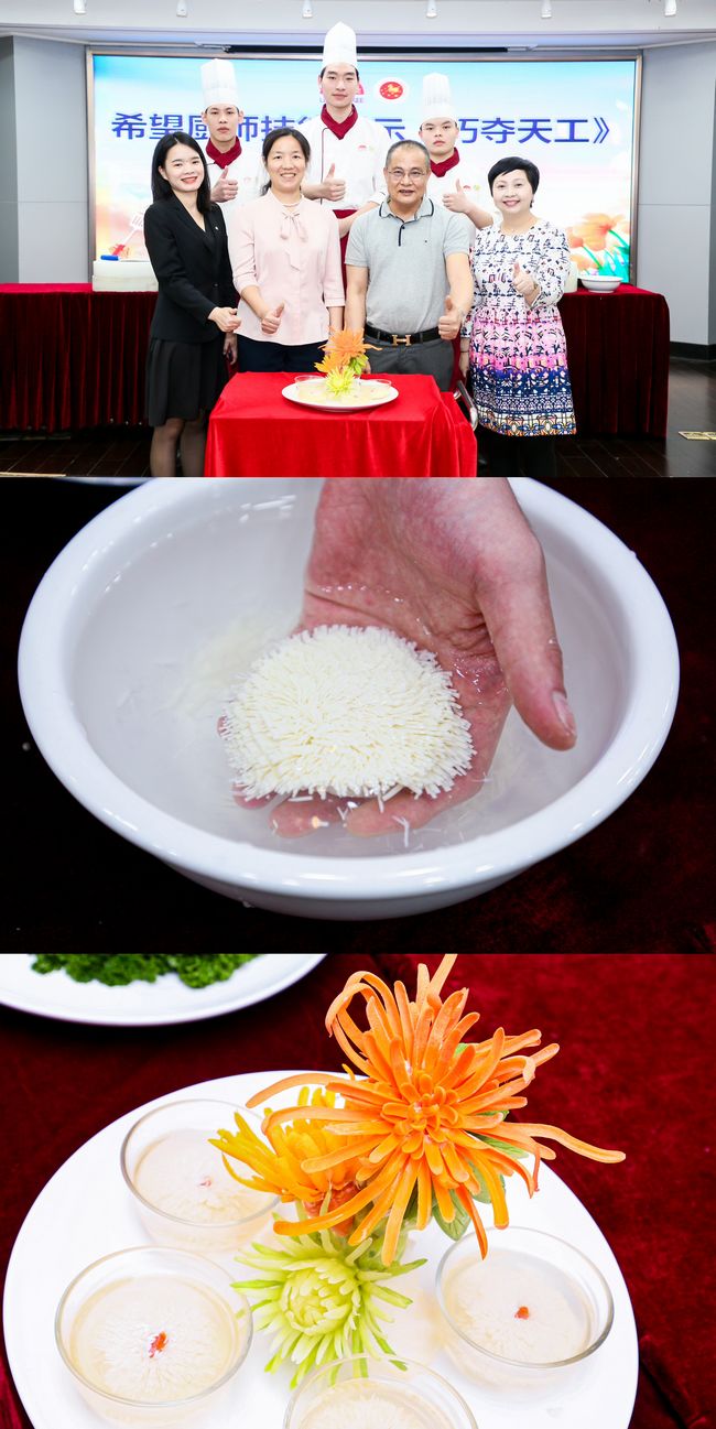 经过三年系统的烹饪学习,同学们的专业技能可谓大幅飞跃,毕业典礼上,他们带来了技能表演——菊花豆腐。砧板上一块小小的豆腐,细嫩易碎,却在同学们稳定的刀工手法和精妙的技巧下,被“雕琢”成了一朵绽放的菊花,花瓣连而不断,细如银针。再将改刀后的豆腐放入水中,手掌轻轻抖动,随着水的浮动,豆腐丝摇曳舒展。这朵婆娑生姿的“菊花”再以清澈的菌菇高汤打底,搭配枸杞,配色风雅,营养丰富,经常被用来作为国宴汤品。