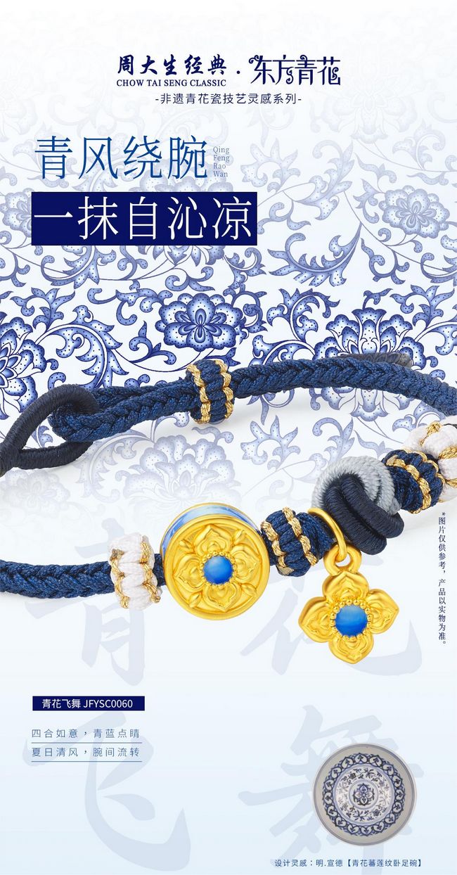 青花国瓷,典雅端方。周大生经典东方·青花系列“青花富锦”、“青花如画”、“春日暄和”设计元素取自元代【青花缠枝牡丹云龙纹罐】。将青花与云龙纹两种元素合二为一,彰显刚柔并济的本色,送上诸事顺遂的祝福心意。