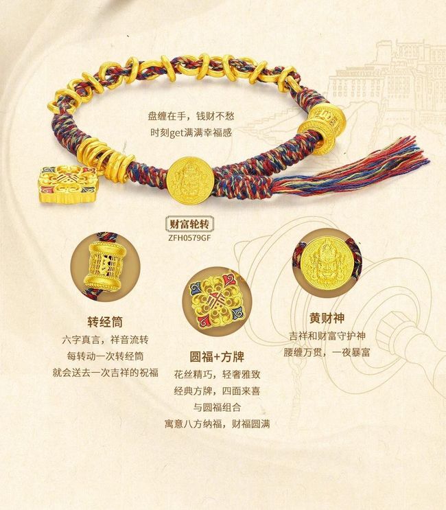 “财福轮转”包含六字真言转经筒、黄财神、四方福牌、盘缠小铜钱等吉饰,送去八方纳福,财福圆满的虔诚祝福。珐琅工艺点缀的吉饰时尚更吸睛,点亮福运更点亮好心情。串联吉饰的手绳采用金刚结和绕线的编绳技法,使其更牢固和更稳定,在传统文化和佛教中更有着坚韧不拔、智勇双全等多重祥瑞寓意。