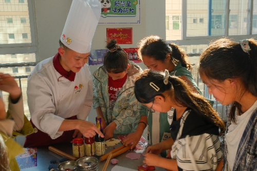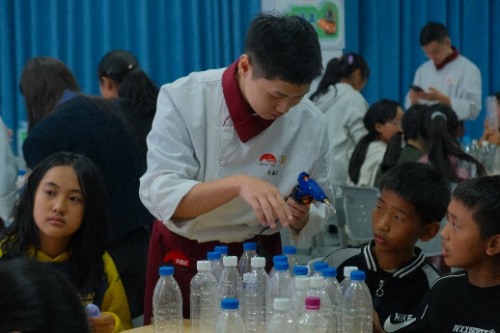 四川凉山州冕宁县的杨阔,2017年通过四川省委统战部的推荐成为一名李锦记希望厨师,入读成都财贸职高学习中餐烹饪,2020年毕业后返回家乡凉山州。现在的他已经是西昌邛海柏悦湾酒店的一名打荷主管,为家乡餐饮行业的发展添砖加瓦。这次,杨阔带着可持续的饮食文化理念,与李锦记可持续“李”想计划一同走进川兴中学,用废弃的塑料瓶共创航天造型环创,致敬家乡“航天城”,致敬中国航天。
