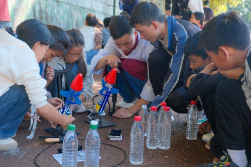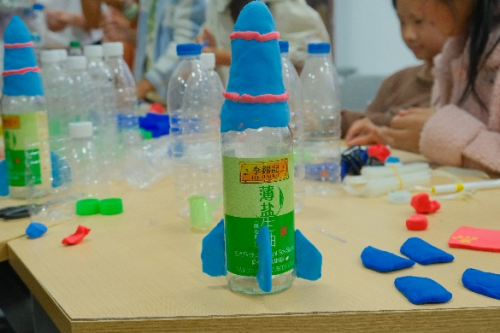 不仅如此,塑料饮料瓶还能摇身一变成为“水火箭”,“嗖”的一声冲上云霄:一个装上水的塑料瓶,一个简易助飞装置,手动发射后,就像一支支冲出的火箭,划破天际,精彩又有趣。