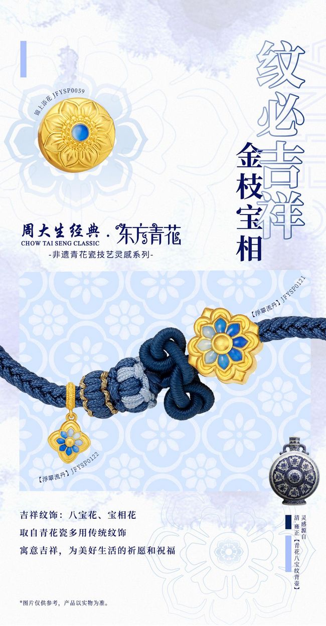 青花国瓷,典雅端庄。周大生经典东方·青花系列“浮翠流丹”从清代【青花八宝纹背壶】中提取设计元素,为产品注入东方文化意蕴。青绿配色的宝相珐琅青花层层绽放,宛若碧池一汪,又似天空一角,具有赏心悦目的视觉效果,更传递着富贵吉祥和圆满的虔诚祝福。