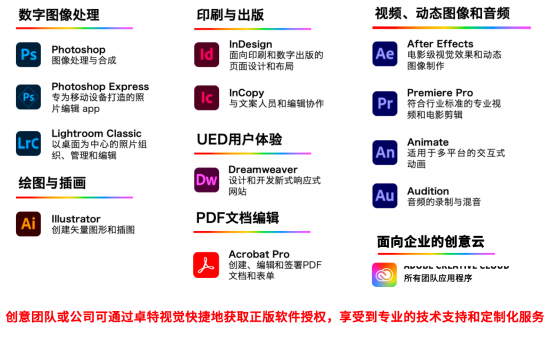 本次双方的深度合作,意味着国内创意相关从业用户群体,能够通过卓特视觉,更加便捷地获取Adobe Creative Cloud套件,其中包括Photoshop、Illustrator、InDesign、Adobe XD、Premiere Pro、After Effects和Audition等经典软件。这些工具的集成化设计,使得创意流转无缝衔接,让创作流程更加流畅。