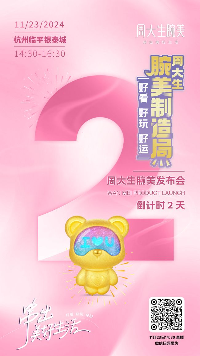 2024年11月23日,周大生腕美将在杭州临平银泰城举行一场别开生面的新品发布会,重磅发布横跨国风国潮、时尚艺术、可爱萌趣等多重风格的串珠新品。腕美推广大使许佳琪也将惊喜空降现场,见证周大生腕美的高光时刻,共同开启黄金珠宝新潮流。