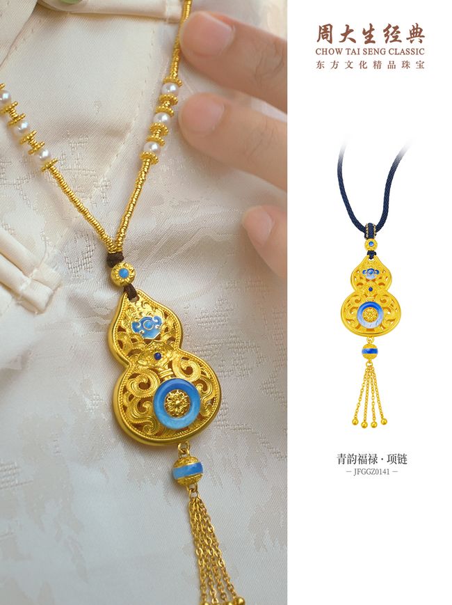 周大生经典东方·青花系列青韵福禄设计灵感源自明成化·青花缠枝莲纹葫芦瓶,汲取青花瓷传统的莲花纹、卷草纹与葫芦瓶器型,让青韵福禄拥有更为典雅的外形和生动的寓意。卷草纹生生不息,象征着蓬勃茂盛的生机和活力, 更代表着万物生长,祥瑞蔓延的美好寓意。
