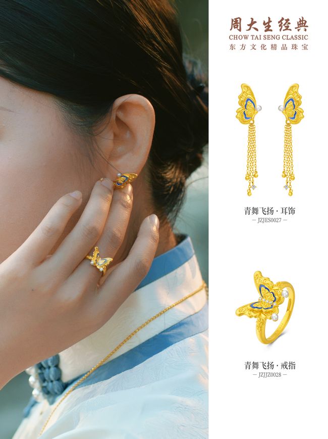周大生经典东方·青花系列“青舞飞扬”设计灵感源自清康熙·五彩蝴蝶纹瓶,青蝶振翅,自瓷中翩然飞出,与金共生灵韵,穿越时空依旧闪耀如初。“青舞飞扬”用黄金、珍珠与钻石镶嵌的奇妙组合打造梦幻优雅的东方美饰,将古朴、优雅以及奢华等风格完美融合,让青花蝴蝶完成华丽蜕变,象征着自由美丽,蜕变新生。