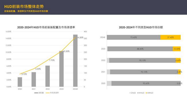 驾驶体验维度:WHUD提升了一定的驾驶安全性和便捷性,但相较于ARHUD,其增强现实效果有限;ARHUD大大扩展并增强了驾驶员对于驾驶环境的感知,提供更加详尽的行车信息,不仅提升了行车的安全性,也增强了行车的舒适度。近些年来,ARHUD也成为了很多中高端车型上市不可或缺的产品亮点,受到了越来越多用户的认可和追捧。
