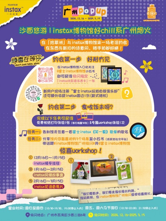 2024年12月16日,富士instax博物馆快闪开启全新旅程。继2023年11月成都快闪和2024年7月昆明快闪之后,富士instax博物馆快闪第三站落户于广州沙面灯塔空间,邀请每一位热爱生活的用户,共同体验那份“分享、真实、长久、珍贵、专属”的instax影像文化。