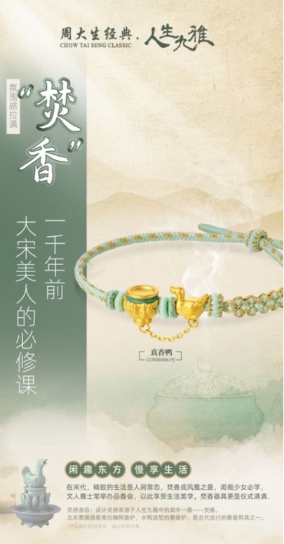 车轮缓缓向前,我们在一屋前停下,推开屋门,腕间那以景德镇窑青白釉香炉为设计灵感的周大生经典“真香鸭”串珠散发着淡雅幽香,弥漫于屋内。串珠采用5D硬金电铸工艺打造,在精巧设计之下,既显轻盈又觉大气,其造型与屋内摆放的水鸭造型的熏香炉别无两样。在熏香的朦胧氛围之下,我们仿佛窥见了宋朝的绝代佳人款款走来,感受到宋朝人充满诗意的日常起居,沉浸于一场跨越时空的风雅之约。