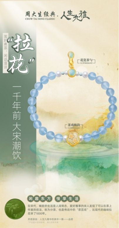踏上时光之旅,我们穿越回那个以风雅著称的宋朝。漫步在青石板铺设的小巷,耳边传来街边集市此起彼伏的叫卖声。在茶馆酒肆里,文人墨客们焚香点茶,挂画插花,畅谈诗词歌赋,挥洒豪情壮志。在繁忙的日常生活中,宋人追求的不仅仅是物质的满足,更是精神上的富足,他们以独特的审美情趣和对生活的热爱,将生活的点滴雕琢成艺术。而周大生经典秉持弘扬东方文化的理念,推出东方风雅生活系列产品,今天,就让我们与周大生经典一同启程,去探索宋朝人的生活方式,去发现那些被岁月尘封的流行之美。