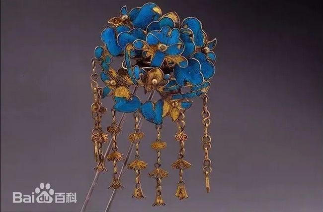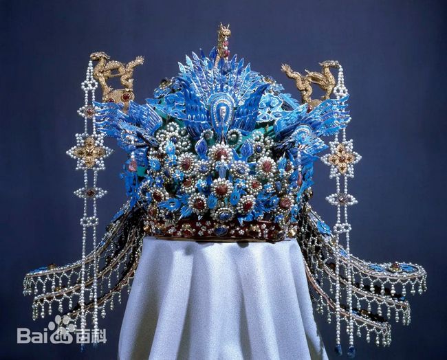 明代最负盛名的凤冠,当属孝端皇后的九龙九凤冠。此凤冠上的龙由金制成,凤采用点翠工艺制成。其冠顶装饰三条龙,中间一条龙口衔珠宝滴,朝向正前方;两边的龙向外呈飞腾之势,龙下方有用花丝工艺打造的如意云头,龙头还口衔长长的珠宝串饰;凤冠前面中层有三只翠凤,呈飞腾姿态,口中所衔珠宝滴稍短。凤冠后面中层的另外三条龙,也呈现飞腾姿态。龙凤珠花及博鬓左右对称,龙凤姿态生动自然,珠宝金翠色泽艳丽,让皇后母仪天下的高贵身份得到最佳体现。
